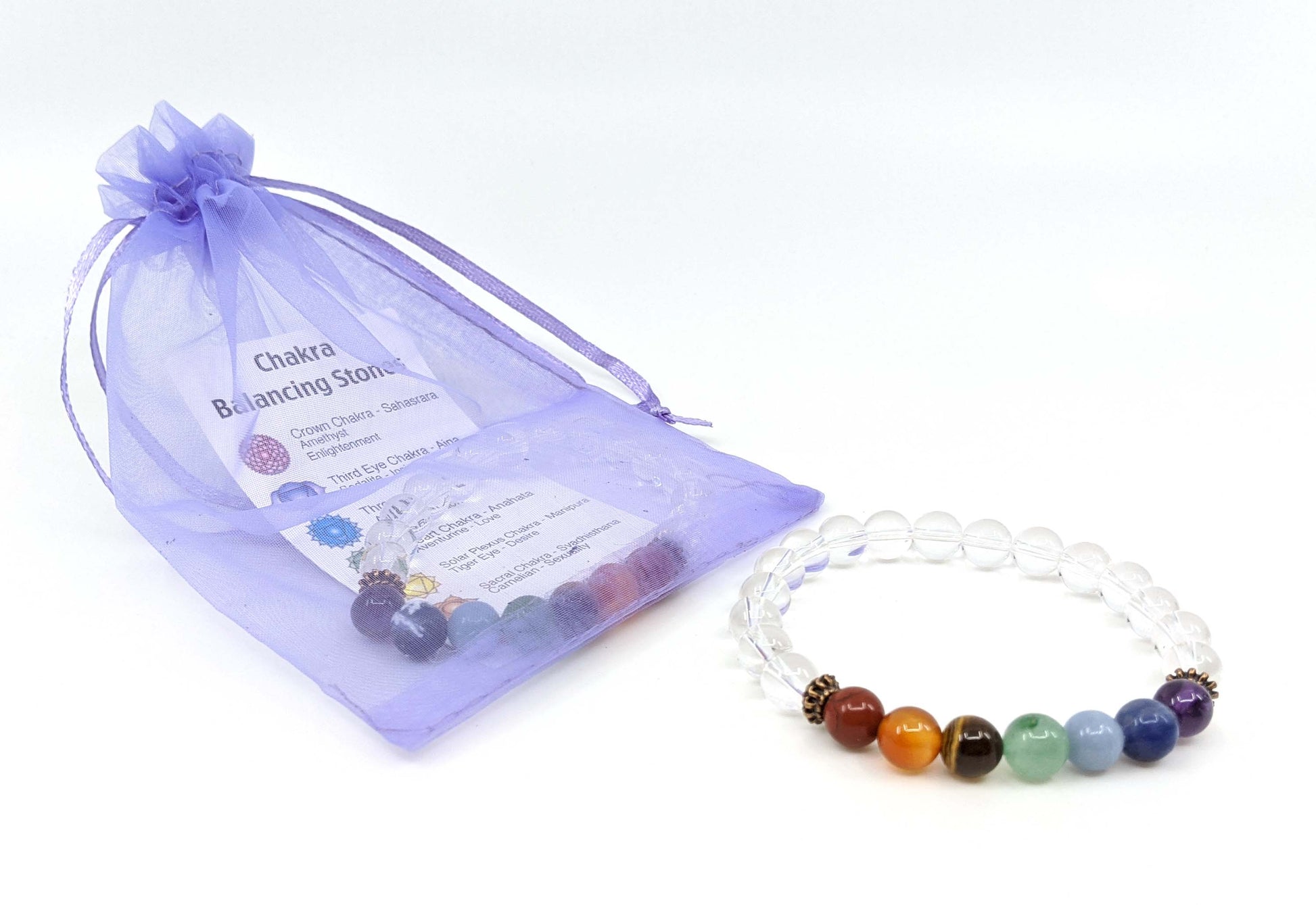 This chakra bracelet has a gemstone for each of your chakras along with Quartz to help amplify the intentions. The stone sections are separated by pewter spacers. Root: Red Jasper, Sacral: Carnelian, Solar Plexus: Tiger Eye, Heart: Aventurine, Throat: Angelite, Third Eye: Sodalite, Crown: Amethyst