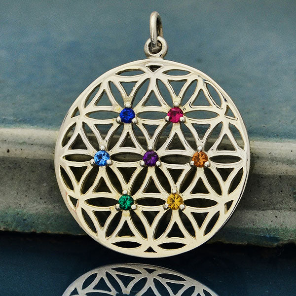 Silver Flower of Life Pendant with Chakra Crystals