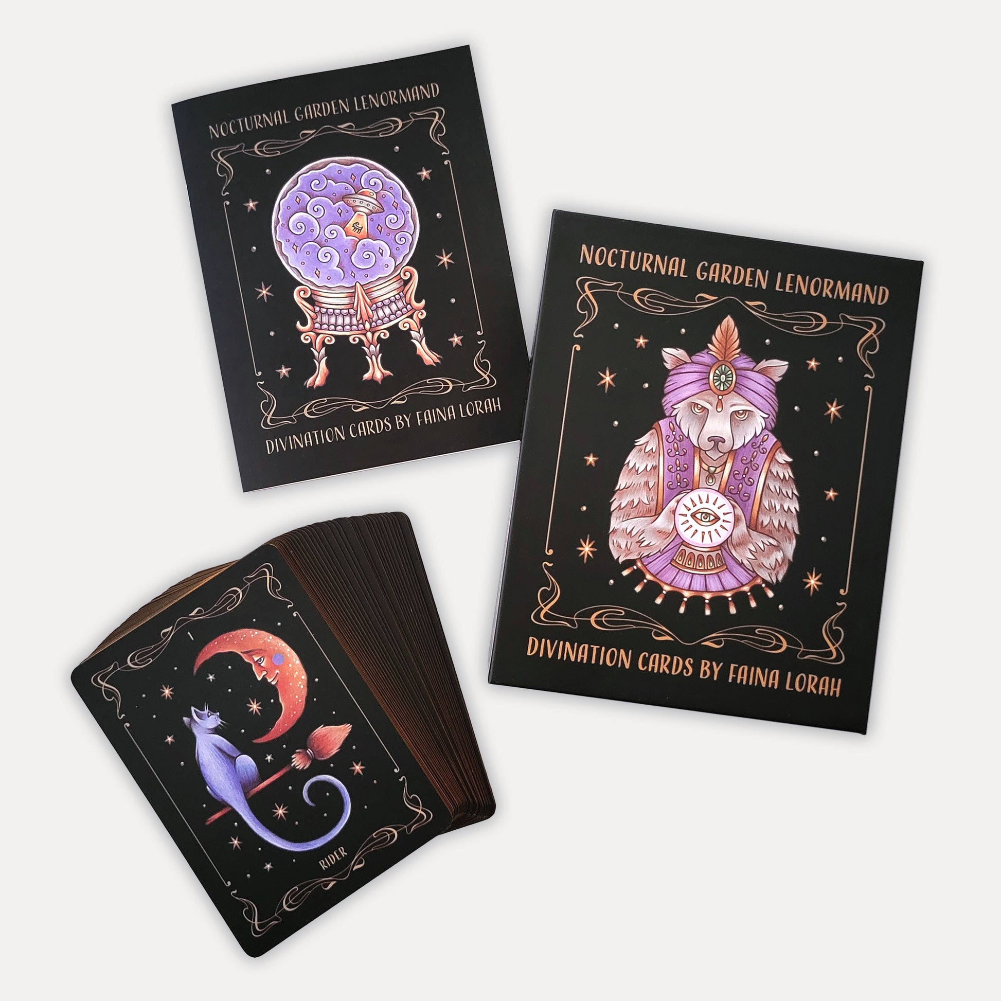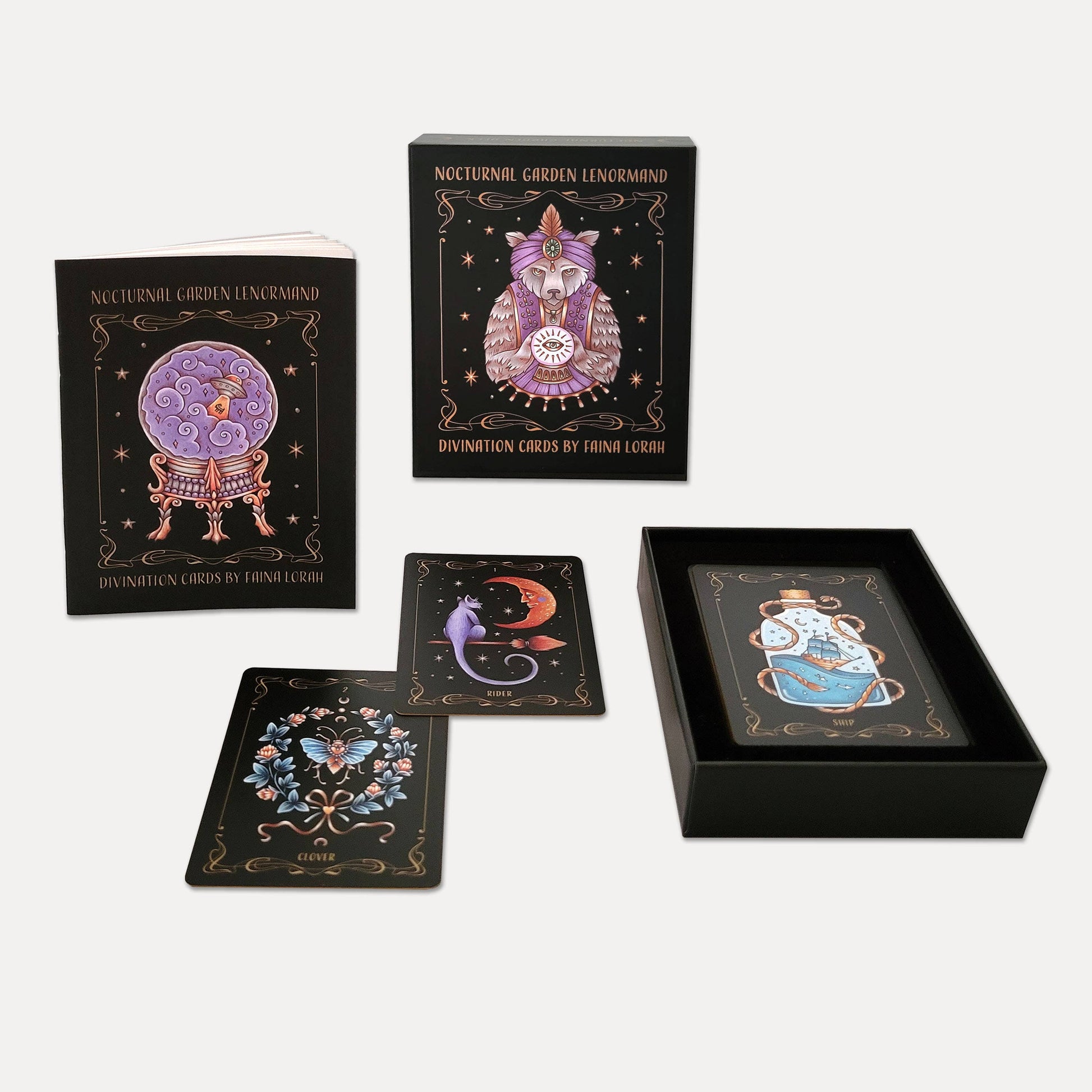 For centuries, luminous plants and enchanting creatures have flourished in secret after dark. Now you can plant your own seeds of divination in the fertile grounds of the nocturnal garden and allow the moon to light your way. Featuring 36 hand-painted cards and a companion book by Faina Lorah, this lenormand deck was created under the stars to share a sense of midnight magic for the curious, the bold, and those wishing to grow their own nocturnal garden.