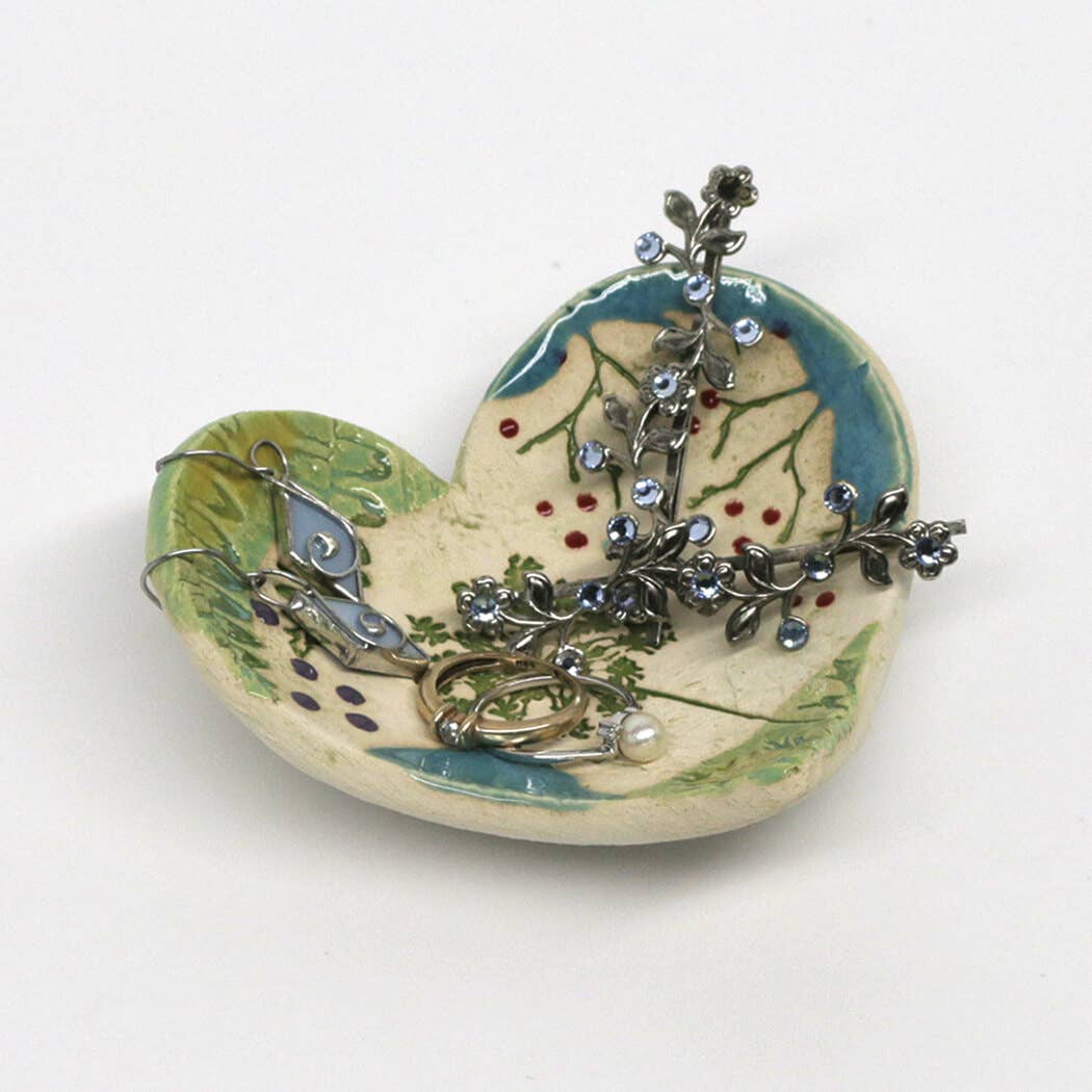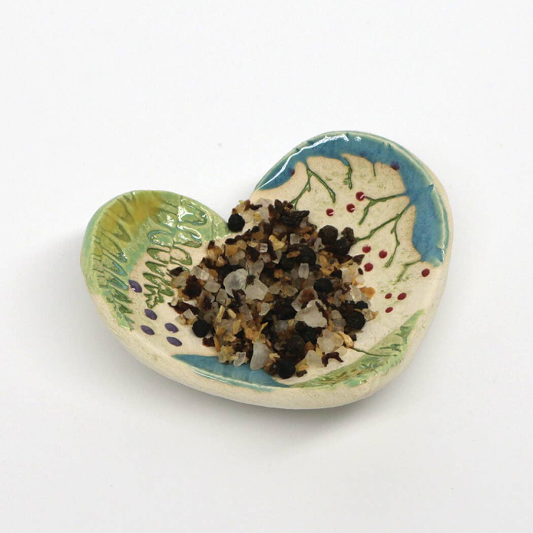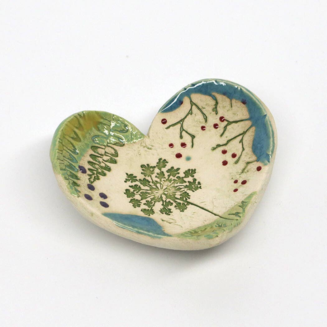 This heart shaped ceramic bowl is handmade from earthenware clay and impressed with native plants and greenery and decorated with food safe glazes of green, gold, turquoise, purple, and a touch of red.