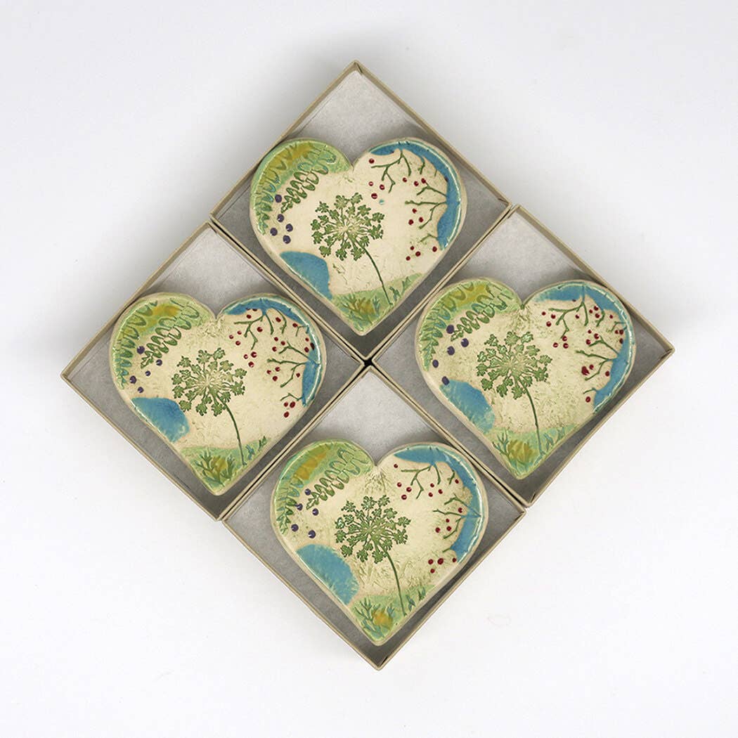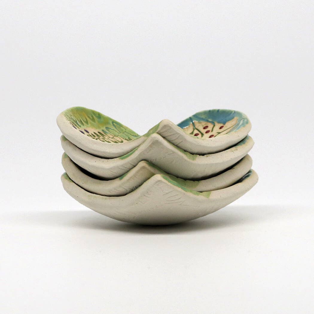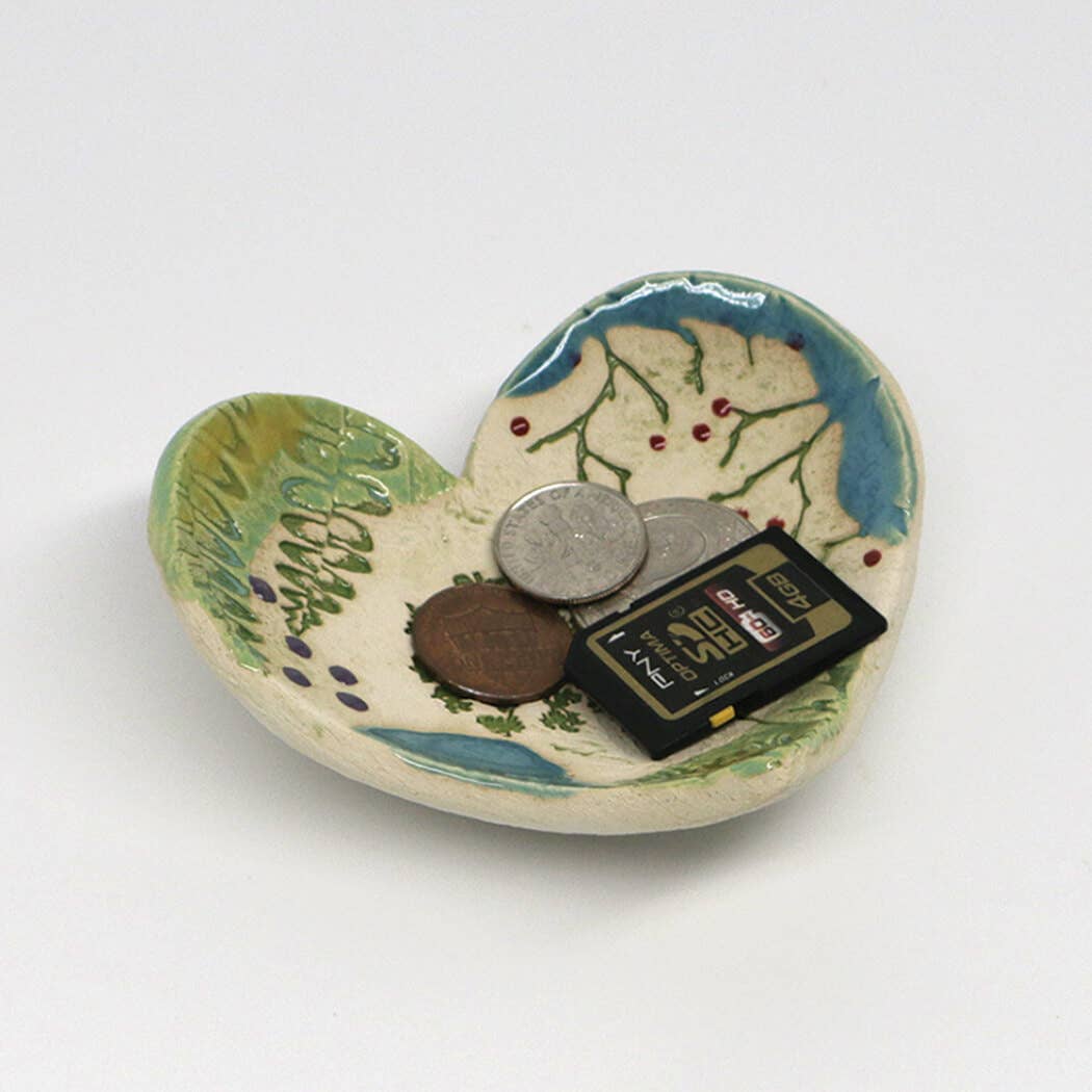 This heart shaped ceramic bowl is handmade from earthenware clay and impressed with native plants and greenery and decorated with food safe glazes of green, gold, turquoise, purple, and a touch of red.