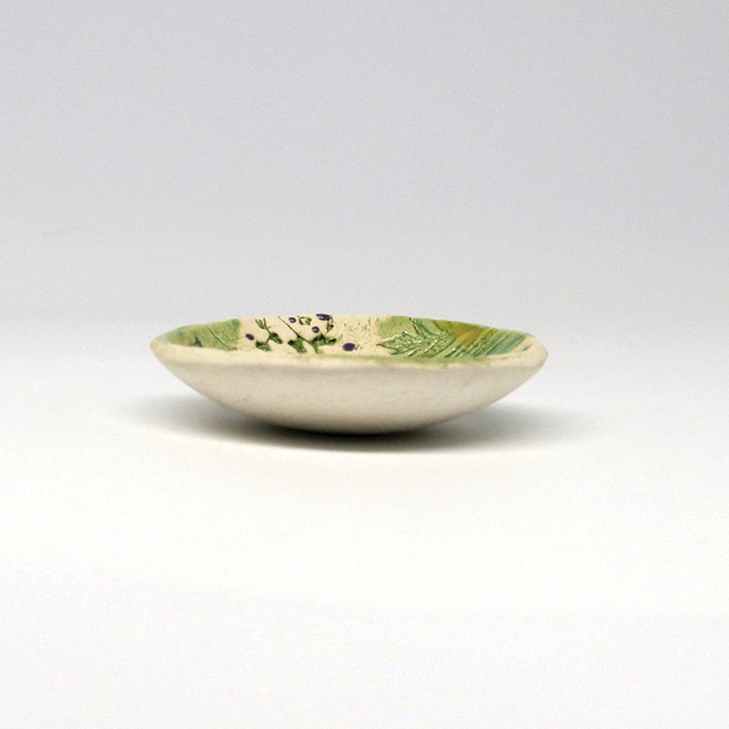 This round shaped ceramic bowl is made from earthenware clay and impressed with native plants and greenery and decorated with food safe glazes of green, gold, turquoise, purple, and a touch of red.