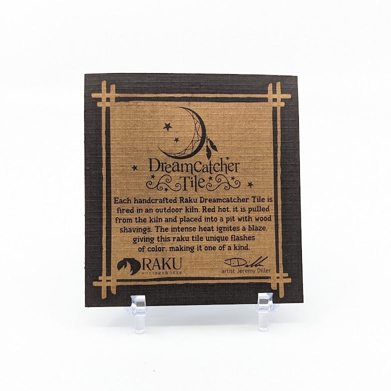 Each handcrafted Raku Dreamcatcher tile is fired in an outdoor kiln. Red hot, it is pulled from the kiln and placed into an earthen pit with wood shavings. The intense heat ignites a blaze giving this Raku tile unique flashes of color, making it one-of-a-kind.